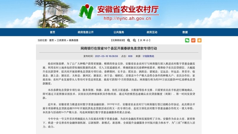 为更大力度支持春耕农户,安徽省与网商银行深入合作数字普惠金融的16个产粮县城,春