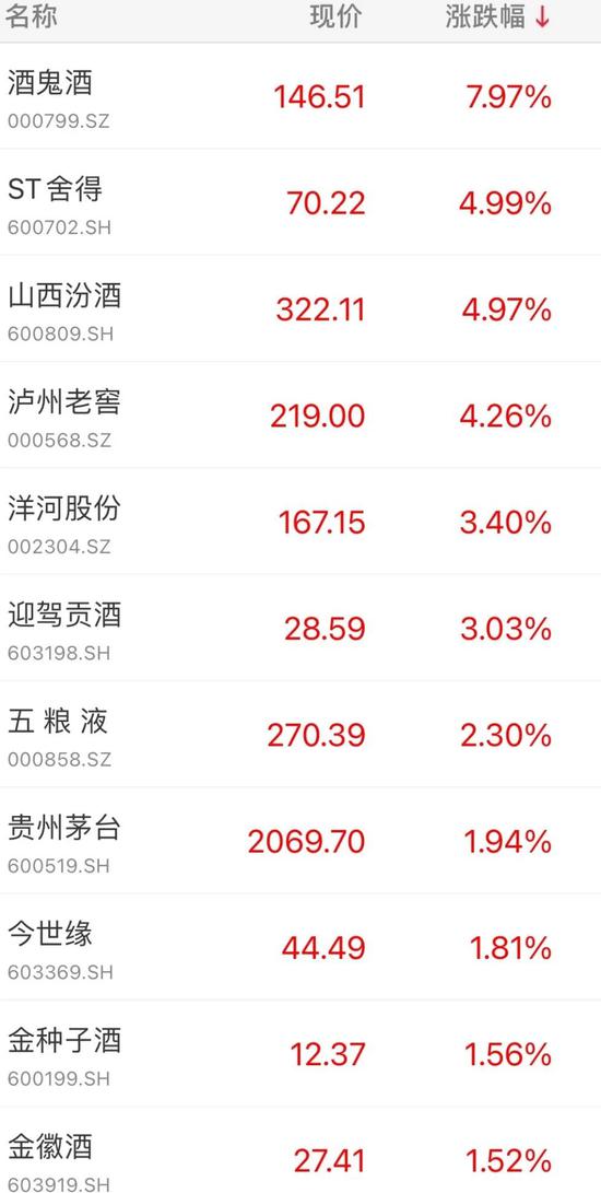 酒鬼酒以7.97%的涨幅领涨,山西汾酒、ST舍得(维权)涨近5%。