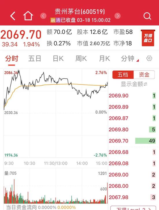 贵州茅台涨1.94%,最新股价为2069.70元,总市值重返2.6万亿元。