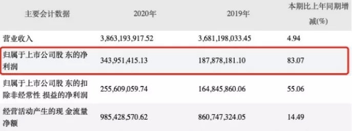 根据2020年年报,公司去年实现营业收入38.63亿元,同比增长5%;归属于上市公司股东的净利润3.44亿元,同比增长83%;每股收益0.43元/股,同比增长79%。
