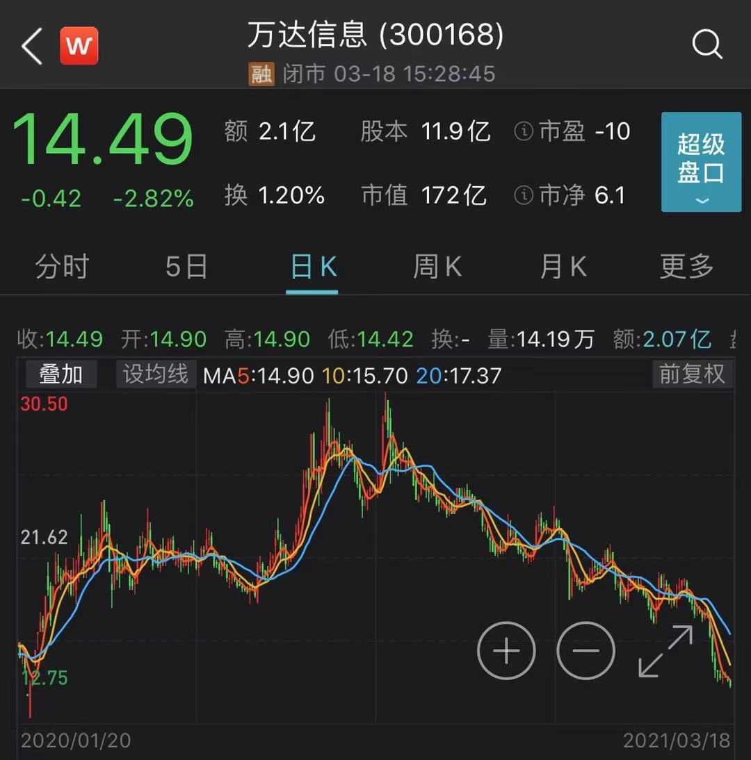 万达信息的股价也随着这一定增出现起伏。去年8月公布该定增时,股价创下4年多高点30.5元,而截至3月18日收盘,万达信息股价收报14.49元,股价腰斩。截至2021年3月10日,公司股东户数为4.01万户。