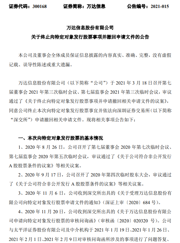 不过,最终,万达信息表示“基于政策原因,公司决定终止向特定对象发行股票并撤回申请文件。”