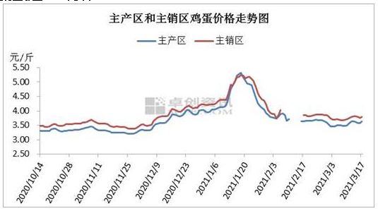 3月16日开始,局部产地鸡蛋价格显现上涨势头,17日产地蛋价全面上涨,17日主产区均价3.64元/斤,上涨0.06元/斤,涨幅1.68%。部分批发市场也小幅上涨,17日主销区均价3.80元/斤,上涨0.04元/斤,涨幅1.06%。