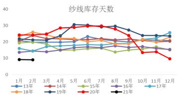 资料来源:一德期货下游方面,产成品库存依然处于近年来较低的水平,纱线和坯布库存维持低位,有较强的需求改善和补库预期。2月纱线库存天数降低至8.97,低于上月的9.21天,也低于去年同期的24.15天。坯布库存天数2月降低至14.65天,低于上月的14.94天,也低于去年同期的29.21天。