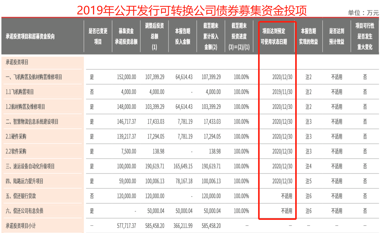 财报显示,截至2020年12月31日,飞机购置及航材购置维修项目累计使用募集资金10.74亿元(原计划为15.2亿元),细分项目中,航材购置及维修项目投资金额由14.8亿元缩减至10.34亿元,飞机购置项目4000万元不变;智慧物流信息系统建设项目累计使用募集资金1.74亿元(原计划为14.67亿元),细分项目中,硬件采购投资金额由13.92亿元缩减到1.73亿元,软件采购投资金额由7500万元骤降至138.98万元;速运设备自动化升级项目投资金额由10亿元大涨至19.06亿元;陆路运力提升项目投资金额由5.9亿元增加至10亿元;12亿元的偿还银行贷款暂未变更;此外,新增偿还公司有息负债5亿元。调整后投资总额为58.55亿元。