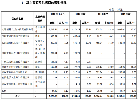 同时,招股说明书披露了主要芯片供应商的采购情况,包括供应商名称、芯片品牌、采购金额等,具体如下表所示(下称“表1”):