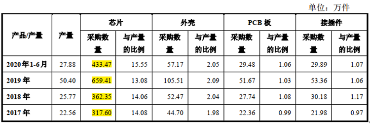 显然,基于芯片采购额和采购数量计算出的芯片平均采购价格与招股说明书披露的芯片平均采购价格并不完全相同,二者分别相差0.63元、0.25元、0.01元和0.05元。