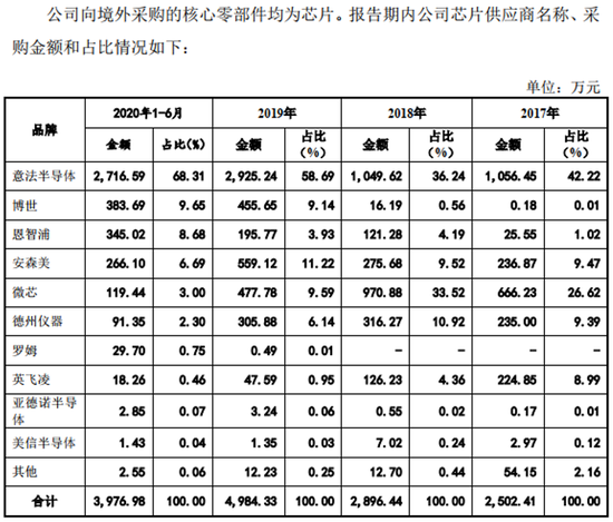 但由表2可知,2017-2019年及2020年上半年,菱电电控采购安森美和英飞凌芯片的金额分别为164.72万元、401.91万元、606.71万元和284.36万元。