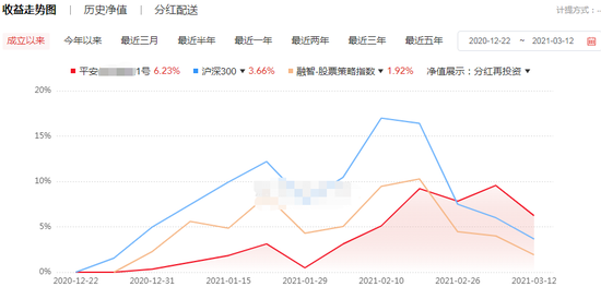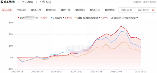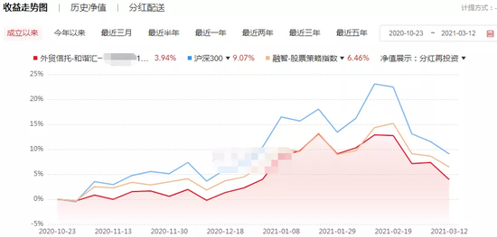 去年10月成立的产品,外贸信托和谐汇一XXXX,截至今年3月12日,累计收益3.94%。因为建仓期的关系,初期没有跑赢指数,不过这段时间回撤控制蛮不错。