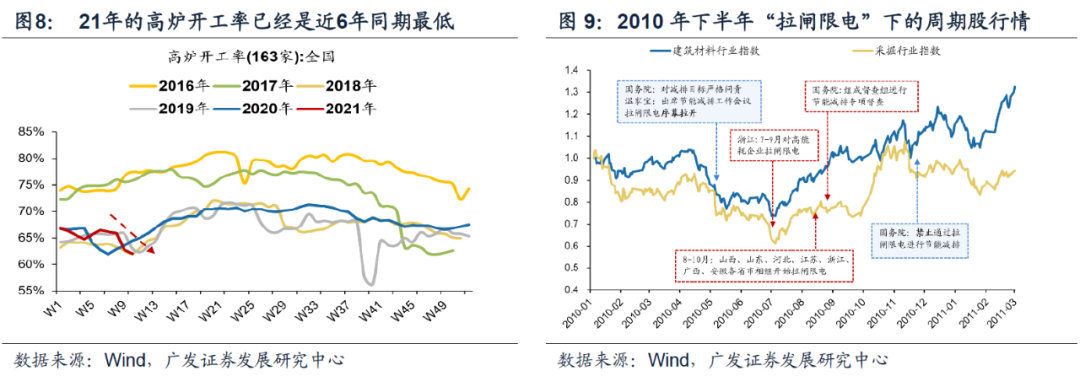 (四)避闹取静,“碳中和”恰逢其时。站在A股产能利用率高位来理解“碳中和”带来的行业供给收缩潜力,类比2010年下半年“拉闸限电”带来的周期股投资机会,市场将从“将信将疑”到“逐步确认”。16年以来的“供给侧改革”以及供给收缩常态化政策导致企业的产能供给低位,产能利用率持续高位,企业长期处于“供需紧平衡”状态。因此产能利用率高位是21年A股盈利的关键特征,在行业“供需缺口”的背景下不可低估“碳中和”对边际限产带来的深远影响。3月19日唐山限产再度升级,钢铁企业执行限产30%-50%的减排措施,在此前生产记录造假的情形下本轮限产预计将严格执行。钢铁作为结构性需求支撑&产能利用率高位&产能供给存在时滞的代表行业,21年高炉开工率已经是近6年同期最低,不可低估边际的限产升级对未来价格与毛利的影响弹性。
