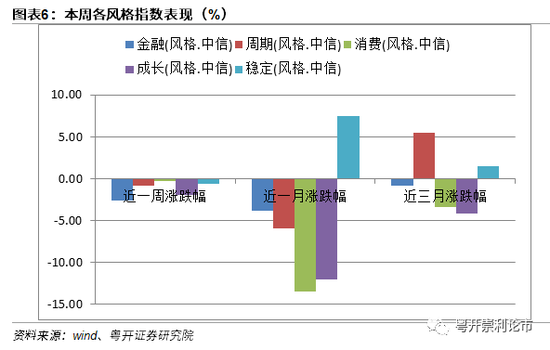 本周各风格指数全部下跌,其中金融和成长跌幅较大。金融风格本周下跌2.65%,成长风格下跌1.99%,稳定和周期风格跌幅相对较小。