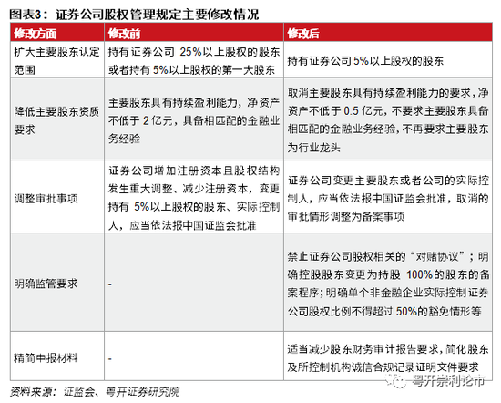 2020年6月,证监会起草了《关于修改<证券公司股权管理规定>的决定》《关于修改<关于实施《证券公司股权管理规定》有关问题的规定>的决定》,向社会公开征求意见,此次发布的《股权规定》与此前征求意见稿变动不大。《证券公司股权管理规定》及其实施规定主要修改以下内容:一是修改主要股东定义,二是适当降低证券公司主要股东资质要求,三是调整证券公司股权相关审批事项,四是进一步明确有关监管要求,五是精简申报材料。具体来看,扩大主要股东认定范围(持有5%以上股权),降低主要股东资质要求(净资产下限由2亿元降至0.5亿元等),简化了部分审批事项,同时进一步明确了部分监管要求。整体来看对证券公司主要股东要求降低,在注册制全面推行、行业全面对外开放的背景下,证券行业有望引入更多参与者。未来证券公司股东数量有望增加,券商股权集中度降低,监管简政放权有助于行业创新发展。