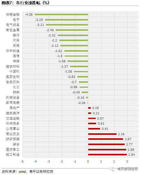 行业方面,本周多数行业下跌,申万一级行业中仅10个行业上涨,其中轻工制造(+2.94%)、国防军工(+2.89%)领涨,非银金融和电子行业跌幅较大。