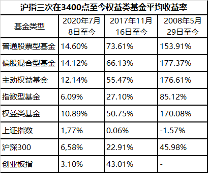震荡市格局之下或许更具备参考意义。基金君统计三次沪指到3400点的震荡格局之下,一次是2020年7月8日,沪指收盘于3403.44点,属于去年市场震荡上扬阶段;一次是2017年11月16日,当时沪指收盘于3399.25点;一次是2008年5月29日,市场为3401.43点,是历经2007年市场大涨之后大跌过程中反弹行情。