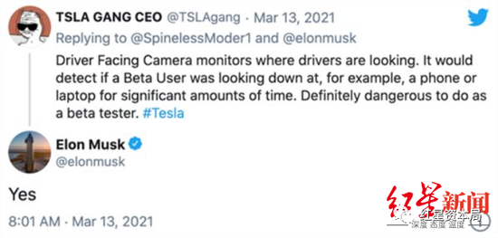 随后有用户向马斯克询问,特斯拉的车内摄像头是否可以监测车主,马斯克直接回复,“是的”。