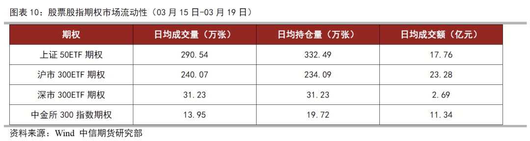 上周四种期权品种日均成交额55.071亿元,成交规模有所回落,但周五受市场大幅下跌影响,再次上涨。上证50ETF期权、沪市300ETF期权、深市300ETF期权及中金所300指数期权日均成交额分别占比32.24%,42.27%,4.89%及20.60%,各期权品种占比较稳定。