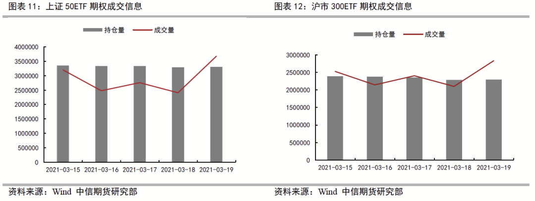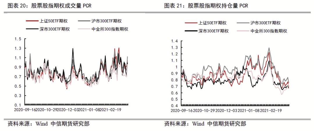 上周,在市场标的大幅波动的背景下,各期权隐含波动率整体表现相对稳定,周五受中美谈判和标的大幅下跌的影响,隐波略有小幅回升,但幅度有限,反映出投资者并无过多的恐慌情绪。但从整体来看,认购期权隐波表现相对认沽仍明显较弱,表明市场整体仍偏谨慎。从卖出期权波动率指标来看,周四、周五该指标有所回升,表明卖出波动率风险上升。我们在2021年度策略报告中指出2021年波动率的波动将有所放缓,更多关注短期事件驱动带来的波动率冲高机会,结合近期出现中美谈判事件扰动,预期近期波动率走高概率上升。