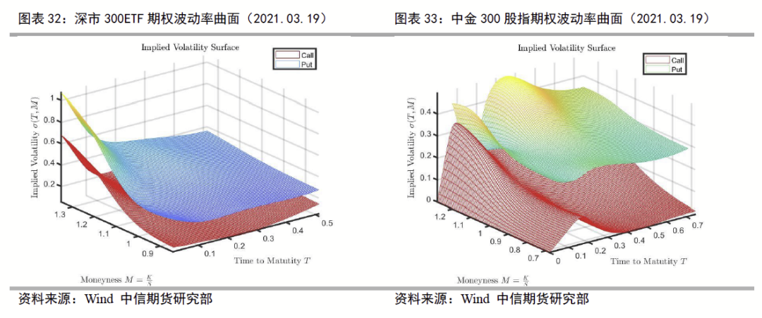从波动率曲面来看,目前四种期权的认购与认沽波动率曲面均较平滑,购沽虚值隐波差相对稳定,期权合成贴水有所回复。