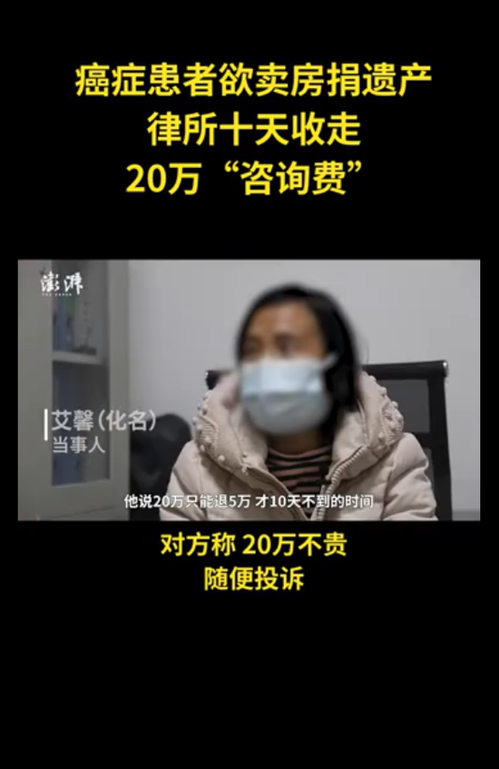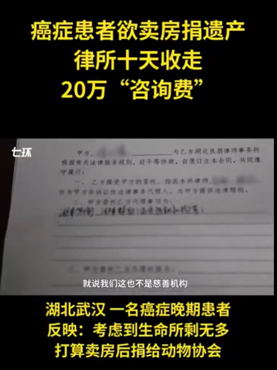 据此前报道,湖北武汉一癌症晚期患者反映:考虑生命无多,打算卖房后捐给动物协会,咨询律师时,10天时间被律师“骗”走20万元“咨询费”。