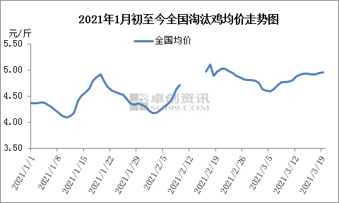 淘汰鸡方面,进入3月份以后,淘汰鸡价格震荡走高。一方面春节过后,适龄待淘老鸡不多,多数地区老鸡货源持续偏紧;另一方面,部分养殖单位主动或被动对蛋鸡进行换羽,加重了适龄老鸡货源紧张的局面。尽管淘汰鸡需求不温不火,但受供应面支撑,淘汰鸡价格稳中走高。