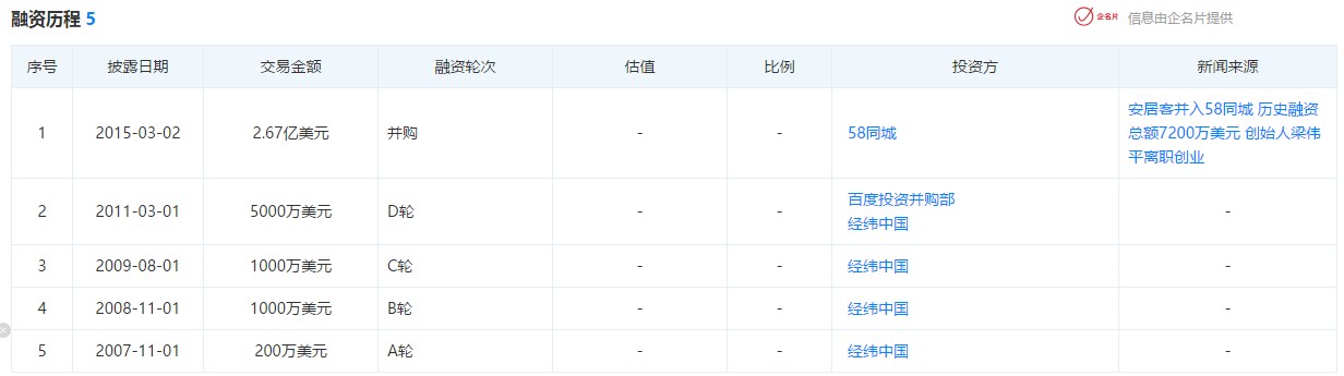 天眼查股东信息显示,该公司由北京五八信息技术有限公司全资控股。根据天眼查融资历程显示,安居客已获数轮融资,过往投资方包括58同城等。