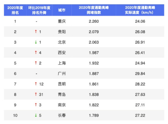百度地图与多家单位联合编写的《2020年度中国城市交通报告》指出,2020年,全国百城交通拥堵排名前10 城市的通勤高峰实际速度均在28km/h以下。重庆、贵阳、北京位列拥堵榜的前三位,通勤高峰时驾车出行要花费畅通时2倍多的时间,才能到达目的地。