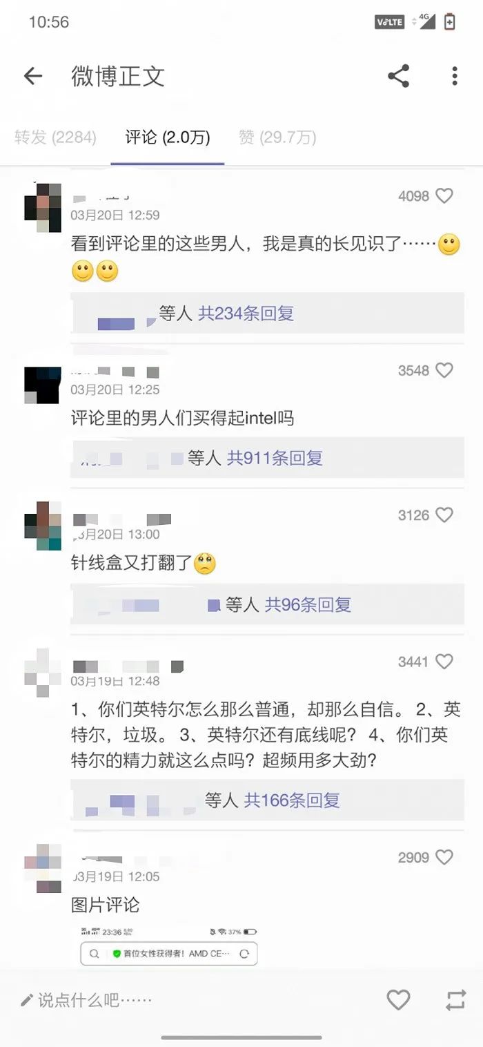 目前,在@英特尔中国的官方微博下方评论已达到2万条,内容多为针对此次事件两方网友的争吵。