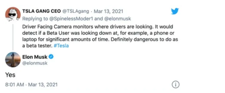 有网友在推特上与特马斯克互动:“特斯拉怎么知道车主行为,是车内摄像头正对着司机么?。”马斯克回应:“Yes”。