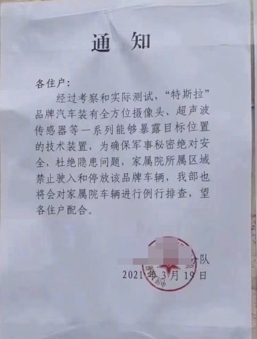 3月19日,一张限制特斯拉车辆驶入相关单位家属院的告示在网络热传。事实上,一些敏感行业或国家机关人士所住的地区禁止特斯拉驶入并不令人意外,此前也有相关人士表示,一些敏感行业也一直不允许使用苹果手机。有消息人士称,中国担心有些内容被特斯拉记录下来传送到美国。