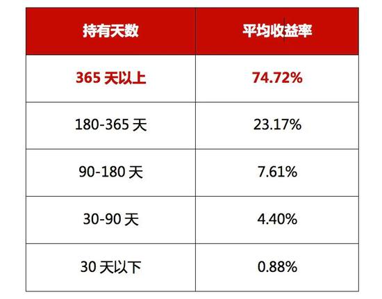 尽管事先早有预期“持有时间越长、大概率投资收益会越丰厚”这个结论,但不同持有周期的客户的收益率差距之巨大仍然让我们大吃一惊——持有产品一年以上的客户以74.72%的平均收益率,碾压其他持有期的客户。