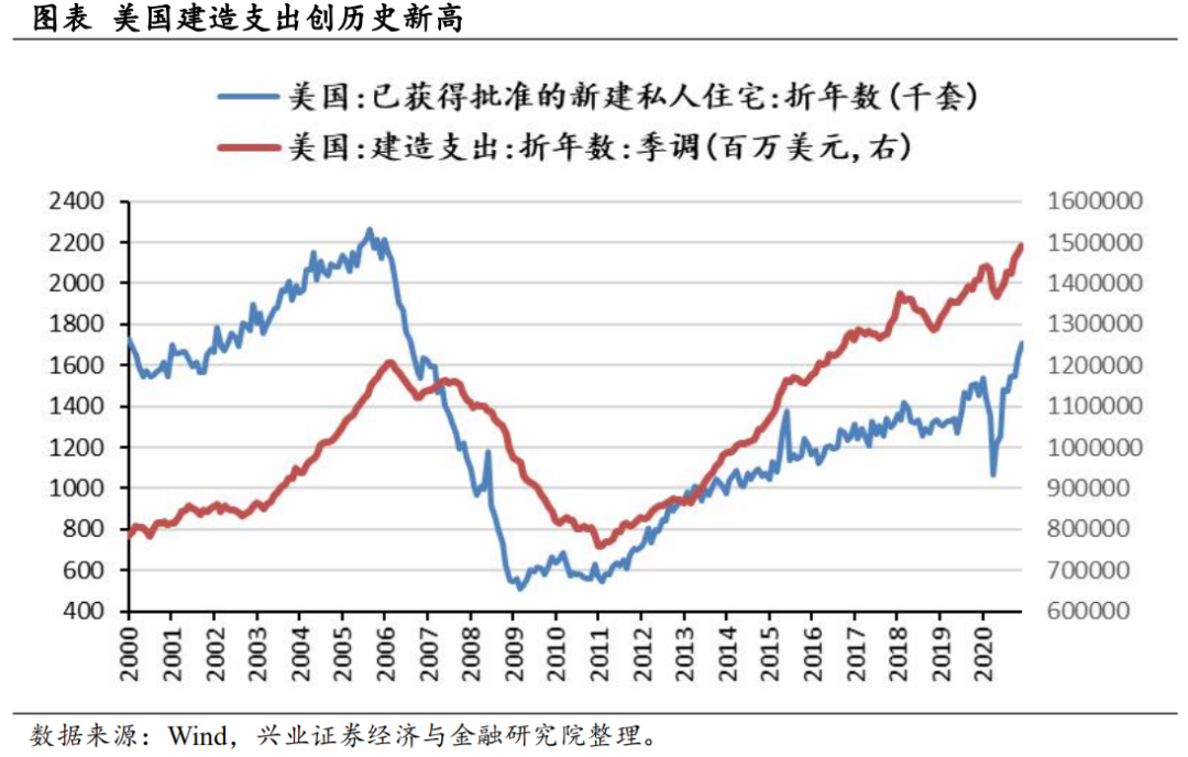 美国房屋供给偏紧,需求旺盛。当前,美国二手房、新房销售量处于历史高位,房屋空置率和出租空置率处于历史低位,并且成屋库存降至历史低点后,住房自有率随之下降,种种迹象表明美国出现“一房难求”现象。从房屋的建造进展来看,美国已批准新建私人住宅套数仅低于上一轮地产周期的最高点,而建造支出已经创出有记录以来新高,显示需求高企下,房屋供给速度也在高位运行。