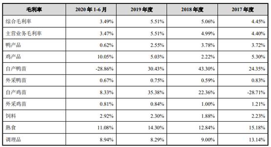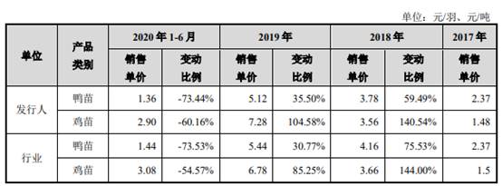 2017年至2020年上半年,益客食品的鸡苗平均售价分别为1.48元/羽、3.56元/羽、7.28元/羽和2.90元/羽,同期鸭苗平均售价分别为2.37元/羽、3.78元/羽、5.12元/羽和1.36元/羽。2020年上半年的鸡、鸭苗的价格较2019年底分别下降了60.17%、73.44%。