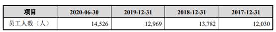 2017年至2020年上半年,益客食品的员工人数分别为12,030人、13,782人、12,969人和14,526人,其中2019年公司员工人数减少超过800人。