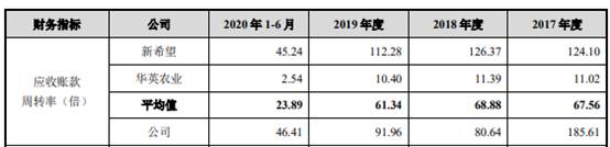 2017年至2020年上半年,益客食品的应收账款周转率分别为185.61、80.64、91.96和46.41次,同行业可比公司的应收账款周转率均值分别为67.56、68.88、61.34和23.89。