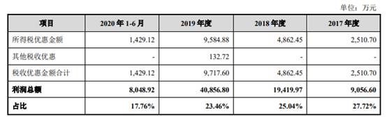 2017年至2020年上半年,益客食品的税收优惠金额分别为2510.70万元、4862.45万元、9717.60万元和1429.12万元,占当期利润总额的比例分别为27.72%、25.04%、23.46%和17.76%。