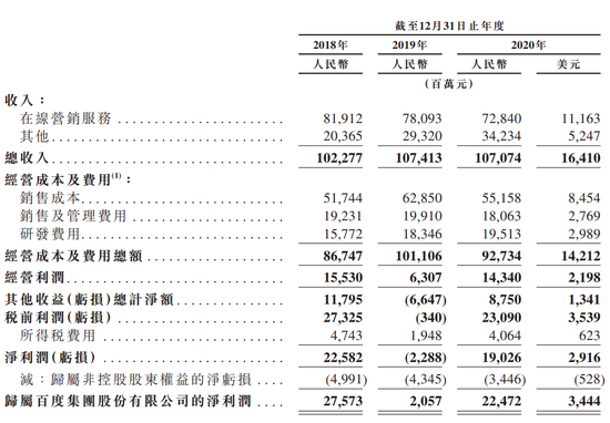 于2018年、2019年及2020年,百度的总收入分别为人民币1,023亿元、人民币1,074亿元及人民币1,071亿元(164亿美元),归属百度集团股份有限公司的净利润分别为人民币276亿元、人民币21亿元及人民币225亿元(34亿美元)。