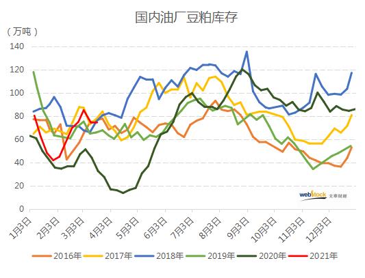 油厂开机率继续回升,豆粕需求还处于慢慢恢复中,导致上周豆粕库存止降小幅回升。截止3月19日当周,国内沿海主要地区油厂豆粕总库存量74.53万吨,较上一周的74.47万吨增加0.06万吨,增幅在0.08%,较去年同期44.05万吨增加69.19%。不过,因巴西大豆收割和装船延迟,及大豆榨利亏损,部分油厂3-4月有阶段性停机计划,而水产养殖需求逐步启动,预计后期豆粕库存还将适度下降。