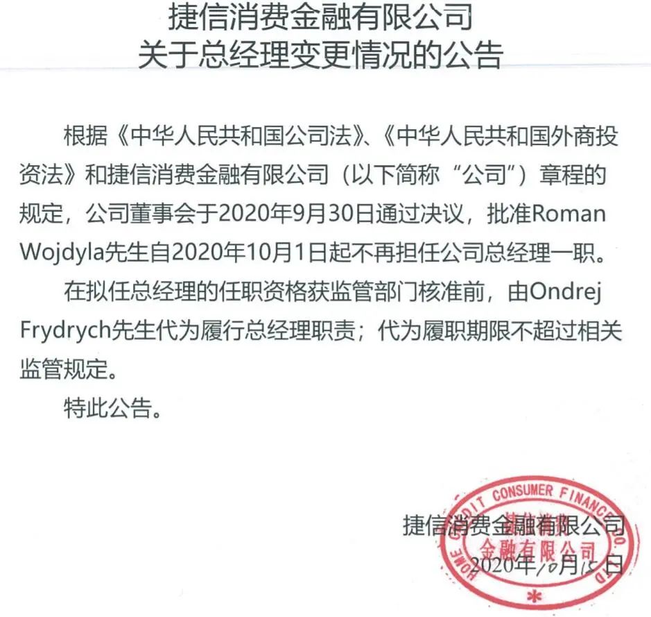 需要指出的是,上述高管变动距去年10月1日捷信消金总经理Roman Wojdyla离任仅过了数月的时间。当时,Roman Wojdyla离任后,即由Ondrej Frydrych代为履行总经理职责。从公告信息来看,截至目前,捷信消金的总经理一职目前疑似已处于空缺状态。
