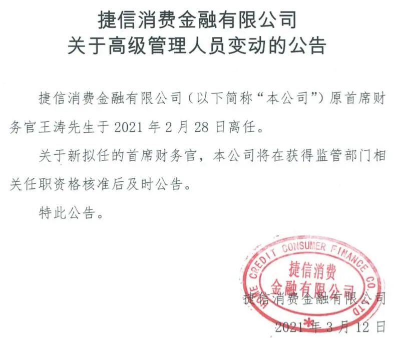 公告信息显示,捷信消金于2021年2月8日通过股东决议,Ondrej Frydrych自2月8日起不再担任公司董事长职务。在拟任董事长的任职资格或监管部门核准前,由Vladimir Nyc代为履行董事长职责,代为履职期限不超过相关监管规定。捷信消金CFO王涛于2021年2月28日离任。关于新拟任的首席财务官,捷信将在获得监管部门相关任职资格核准后及时公告。
