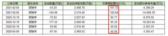 为什么说是高位减持呢?以邹骏宇的各次减持为例,股价由2020年5月的40元/股,一路上涨到2021年2月的101元/股。