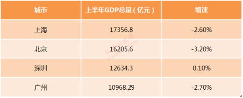 从北上广深四大一线城市来看,上半年北京GDP同比下降3.2%,降幅比一季度收窄3.4个百分点;上海市GDP总量为17356.8亿元,比去年同期下降2.6%,降幅比一季度收窄4.1个百分点;上半年广州GDP总量为10968.29亿元,同比下降2.7%。因此,深圳也成为全国四大一线城市中,唯一一个上半年GDP实现正增长的城市。