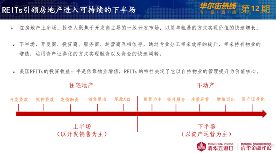 中国现在为什么REITs推出较慢?客观角度,我觉得推得慢对整个的行业影响还是挺大的。我们整体上还是“重建设不重运营”。我们一说房地产,经常就约等于住宅地产了,刚刚天阳教授讲到了“房住不炒”,实际后面还有4个字叫做“租购并举”,你租谁的?谁去持有资产?这也就对不动产或者 REITs 提出了一个要求,大家都想做轻资产管理,谁去持有重资产?实际上就需要 REITs 来做这个重资产的持有。所以过去几年一直在呼吁,不要老提房地产了,或者说我们至少把房地产要分为住宅地产和不动产。两者有什么区别呢?住宅地产,是拿地后盖房子,预售掉了,所以基本上全是销售一空,属于快周转,很多开发商做的模型就是快周转,基本上两三年整个项目就能转一圈。那么不动产是什么?是指所建或买的房产,基本上是不卖的,要不断的持有,以每年运营的租金收益为主,所以投资回收期很长。所以住宅地产和不动产的商业模式是完全不一样的,我们不能再笼统地把它叫为房地产,还是把它叫成住宅地产和不动产两个行业更合适。