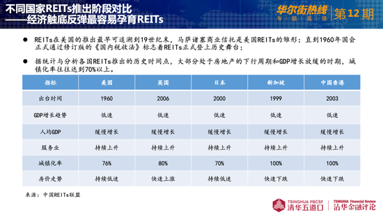 REITs实际上是一个危机的产物,伴随着危机出现。美国在1958年到1959年经济比较的低迷,1960年艾森豪威尔总统签署了第一个REITs法令。说到亚洲,1998年亚洲金融危机之后,日本在2000年,新加坡在1999年,香港在2003年,都分别推出了专门的REITs法规。所以中国的REITs是建立在国外REITs的实践基础上,推出正当时,因为中国的基础设施或者不动产存量已经很大了,通过REITs产品可以盘活原有存量,同时引导经济去向经营资产而不只是靠投资拉动,同时也给投资人提供一个介于股和债之间的产品。因为REITs很重要的一点就是强制分红,每年给投资人大概要分到5个点甚至5个点以上,同时资产升值,股价还会有增长,基本上会做出一个大概年化在10%上下的一个金融产品,对于我们财富的积累还是很重要的。
