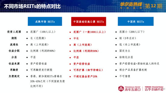 我对比了一下这些特性,给大家看一下不同的参数。中国是2014年出现了中信启航这样的类REITs,我们业界的人叫类REITs,它不是真REITs或者就不是 REITs,因为它是一个偏债性的安排,原始权益人还是要做很多流动性支持,或者回购的承诺。所以,中国的类REITs是一个偏债性的安排。刚才我们讲的估值很重要,因为左边的这两栏是真正的权益性REITs ,那就是买卖自负了,买贵了后面就可能要赔钱,所以我觉得权益性 REITs是跟右边的类REITs是最为不同的。再就是类 REITs 原来只能卖200份,现在基础设施 REITs 可以卖1000份以上,终于可以公募了,时限也从原来的3+3+3改成了可以做10年,甚至10年以上还可以延长,流动性也会大大提高。