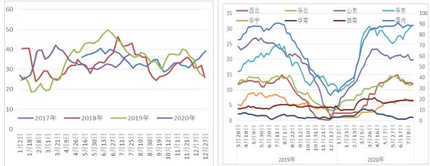 由于受到沥青厂不断提升开工率、多地区洪涝以及梅雨季节影响,沥青供应在炼厂端积累,此前沥青厂库存率已经连续三周增加,但下游贸易商库存并未出现明显累库存,说明终端需求在雨季并未明显变差,最新一期沥青厂库存率下滑,炼厂端压力有所减轻,据隆众资讯数据显示,截至2020年7月29日,厂库库存率在33.89%,环比下滑3.57%。分区域来看,此前华东、东北地区库存增加较多,华东地区厂库从6月份开始一直累库,东北地区厂库从7月份开始累库,最新一期数据显示,西北、华北、华东均出现明显降库。