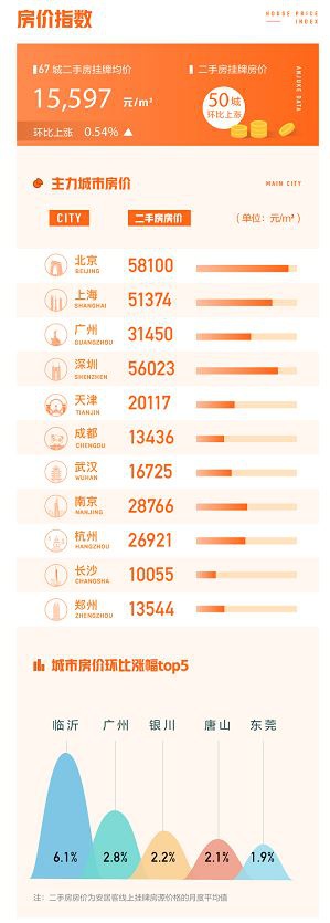 报告显示,7月全国67个主要城市二手房挂牌均价为15597元/平方米,环比上涨0.54%,有50城二手房挂牌房价环比上涨。其中,北京、深圳、上海二手房挂牌均价均稳定在5万元/平方米以上,其中北京58100元/平方米依旧位列第一,深圳和上海分别以56023元/平方米和51374元/平方米紧跟其后。临沂、广州、银川、唐山和东莞二手房挂牌均价环比涨幅最快,成为全国二手房环比涨幅top5。其中,增幅最快的临沂达到6.1%。