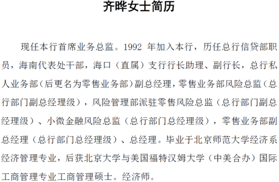 此次正式履新副行长的齐晔和杨兵兵,均系光大银行内部提拔,均有丰富的银行业从业经历。相比于杨兵兵,齐晔更可谓是一名“老光大人”。齐晔于1992年加入光大银行,成为该行总行信贷部的一名职员。值得注意的是,光大银行成立于1992年8月,是一家总部坐落于北京的股份制商业银行,而齐晔可以说是与光大银行共同成长。