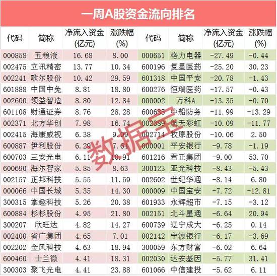 单只股票来看,格力电器、复星医药、中国平安、恒瑞医药、万科A、中船防务、航天彩虹、牧原股份等8股主力资金净流出超10亿元,其中家电龙头格力电器净流出规模27.49亿元居首。五粮液、立讯精密、歌尔股份等3股主力资金净流入超10亿元,其中白酒龙头五粮液主力资金净流入规模16.68亿元居首。