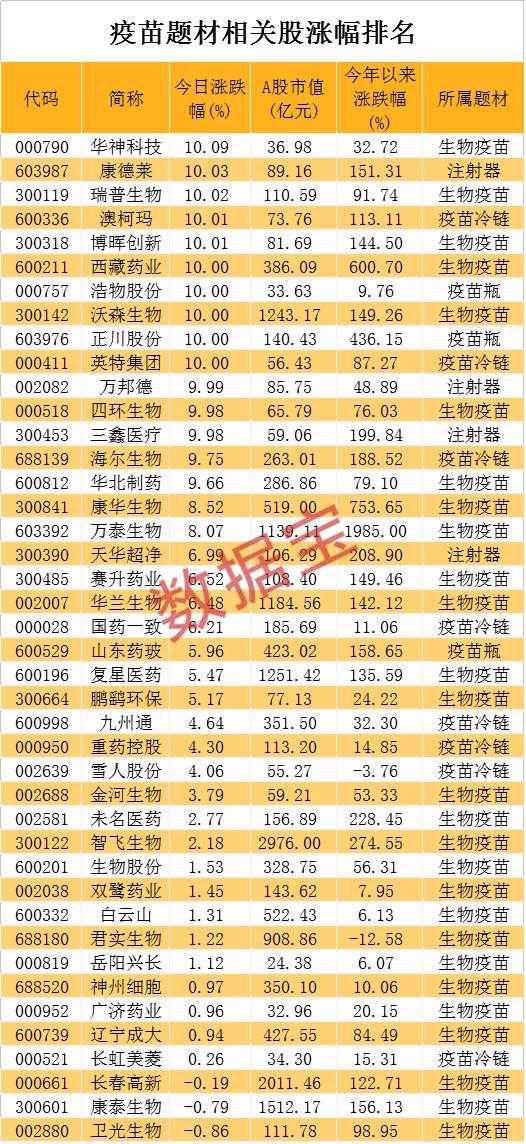 随着新冠疫苗的研发逐步推进,A股关于疫苗相关题材的炒作浪潮迭起。从参与研发新冠疫苗的公司,到疫苗冷链配送,再到疫苗包装材料,疫苗题材的炒作版图也在不断扩大。在此期间,一大批牛股扎堆涌现。证券时报·数据宝统计显示,疫苗类题材股中,已有16股年内涨幅翻倍(注:今年上市新股不含上市首日),分别包括万泰生物、康华生物、西藏药业、正川股份、智飞生物等。