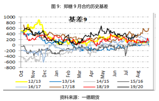 合约到期前后持仓量的高低通常和最终交割量的高低成正比,而19年以来的持续低持仓低交割量也显示出市场对于当前低糖价的无奈。合约到期前的持仓量不代表实际交割量,二者会有较大的差异,如上图所示,最后的实际交割量是低于最后持仓量的,在今年如此低迷的持仓背景下,在仓单长期维持地量的基础上,今年剩余合约的交割预期并不高,对于当前即将交割的9月合约来讲,9月前后国产糖库存压力不高,剩余库存有限,但进口糖预期大增,虽然没有明文规定进口糖不能交割,但历史习惯是还未见到进口糖交割过,所以所谓的多头逼仓结论尚早,而空头能否有足够的货源交货也值得考证,预期除了进口糖意外的糖源上有多少可供交割将成为9月交割前后主要关注的焦点之一。